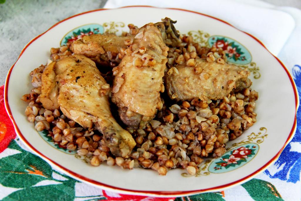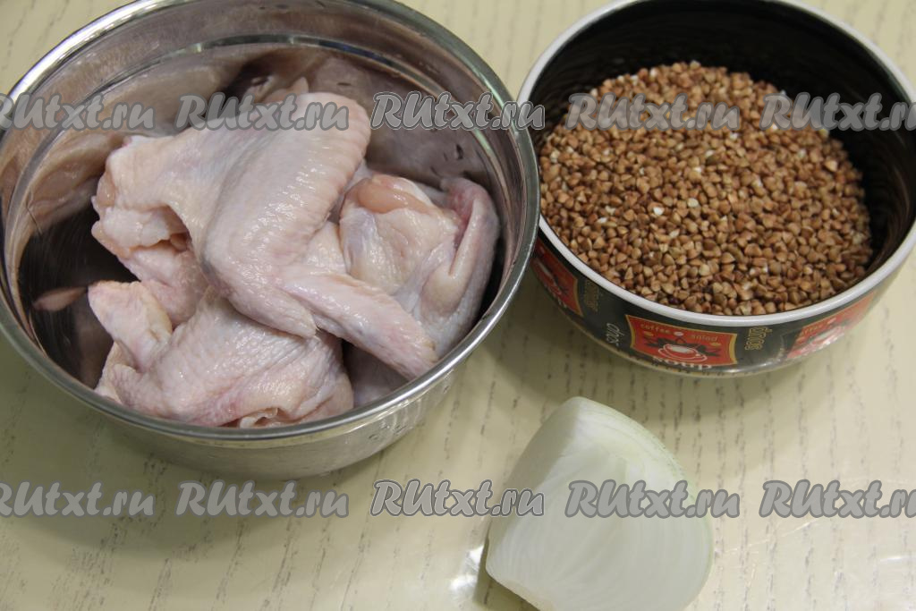 Подготовить продукты. Для этого блюда можно взять любые части курицы (я решила готовить куриные крылья). Части курицы промыть водой, обсушить. Лук почистить. Гречку, если в ней много некачественных зёрнышек, нужно перебрать, затем выложить в сито и хорошо промыть проточной водой, дать лишней воде стечь.