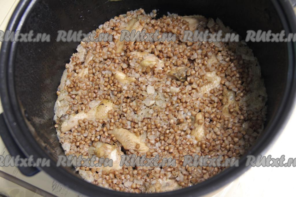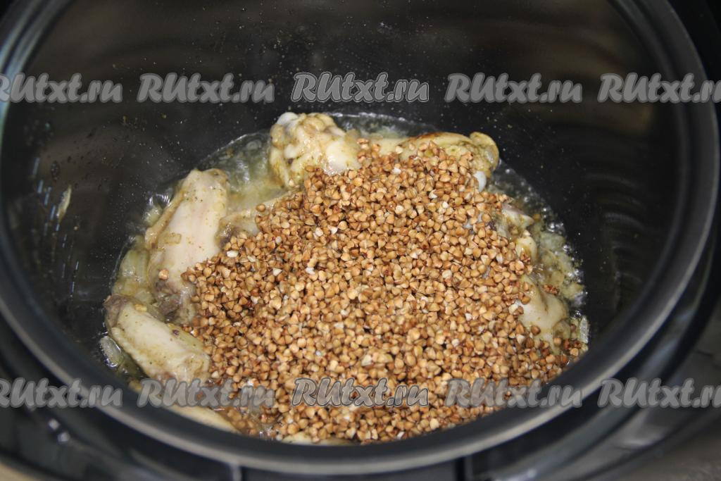 К обжаренным частям курицы всыпать подготовленную гречку.