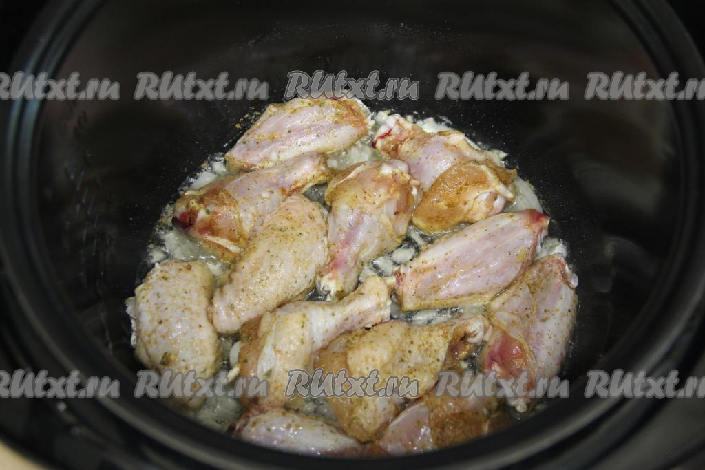В чашу мультиварки влить растительное масло. Выставить на 15 минут режим мультиварки "Жарка". Выложить в чашу нарезанный лук, обжарить его, иногда помешивая, до прозрачности (в течение 5-6 минут). Затем выложить части курицы, обжарить в течение 8-10 минут, периодически переворачивая мясо и перемешивая лук.