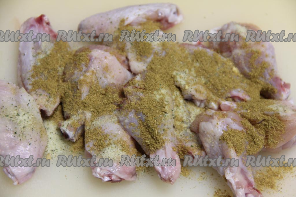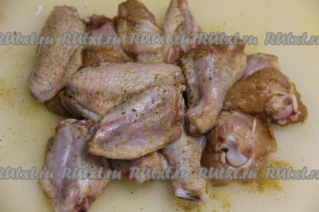 К частям курицы добавить соль и специи (в качестве специй я использовала карри).