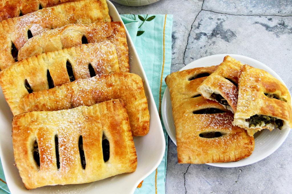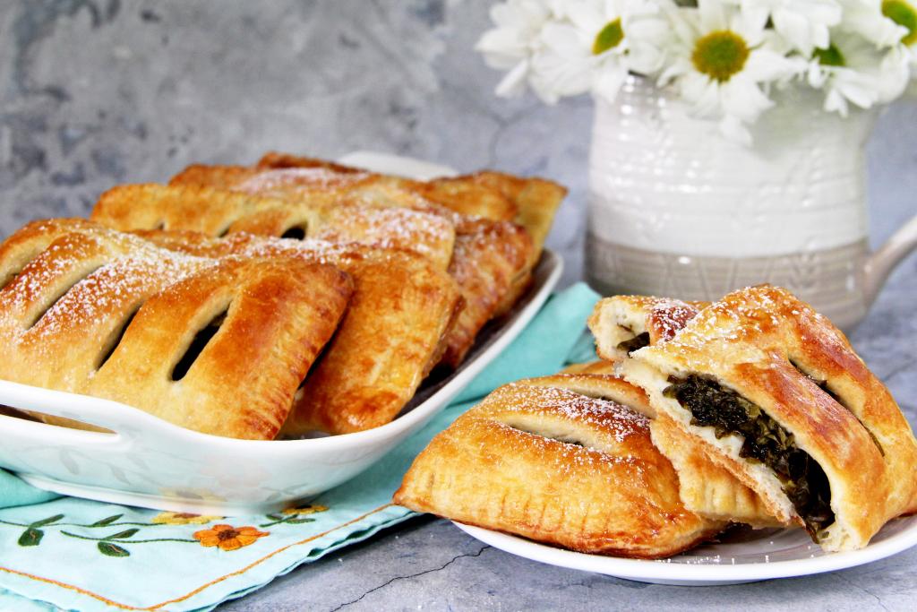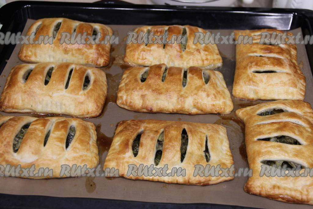 Аппетитные, сладкие, воздушные пирожки с щавелем, приготовленные из слоёного теста, вынуть из духовки, переложить на тарелку. Эту вкусную, нежную выпечку можно подать к столу и тёплой, и полностью остывшей.