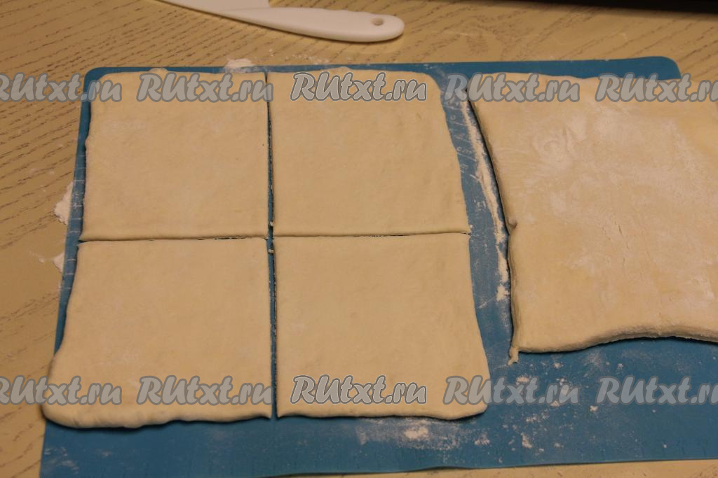 У меня слоёное тесто было в двух пластах. После того как тесто разморозится, нужно на рабочей поверхности, присыпанной мукой, каждый пласт теста раскатать в прямоугольник толщиной 2 миллиметра. Каждый раскатанный пласт разрезать на 4 одинаковых части. В результате из двух пластов получатся 8 заготовок.