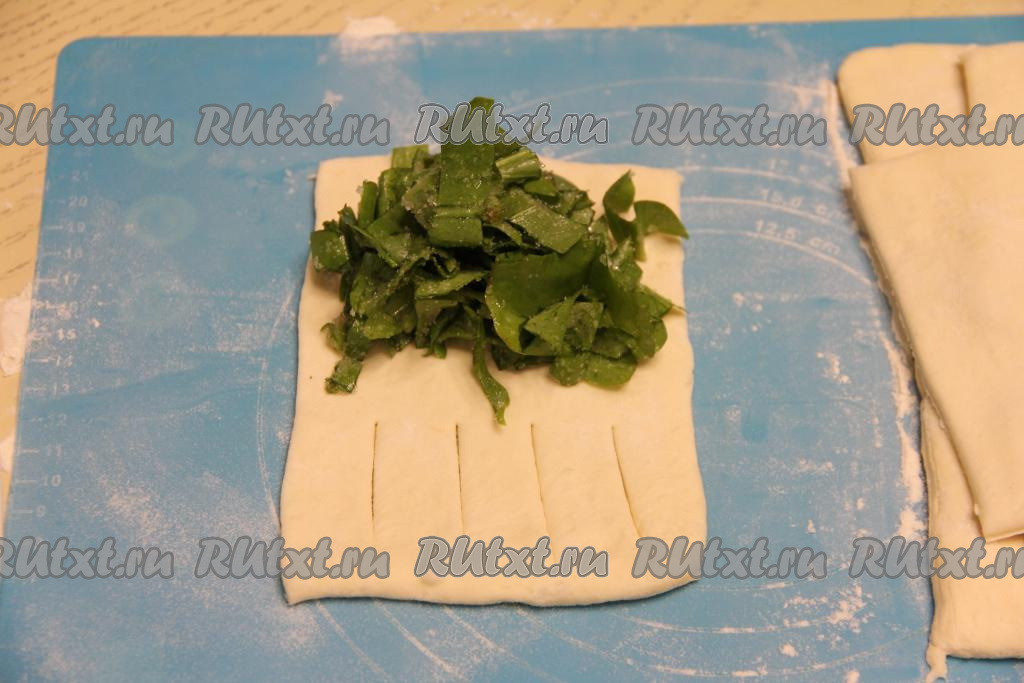 Начинку из щавеля, смешанного с сахаром, зрительного разделить на 8 частей (по количеству заготовок из теста). Выложить 1 часть щавелевой начинки на сторону теста без разрезов, не забывая отступать от краёв по 1-1,5 сантиметра.