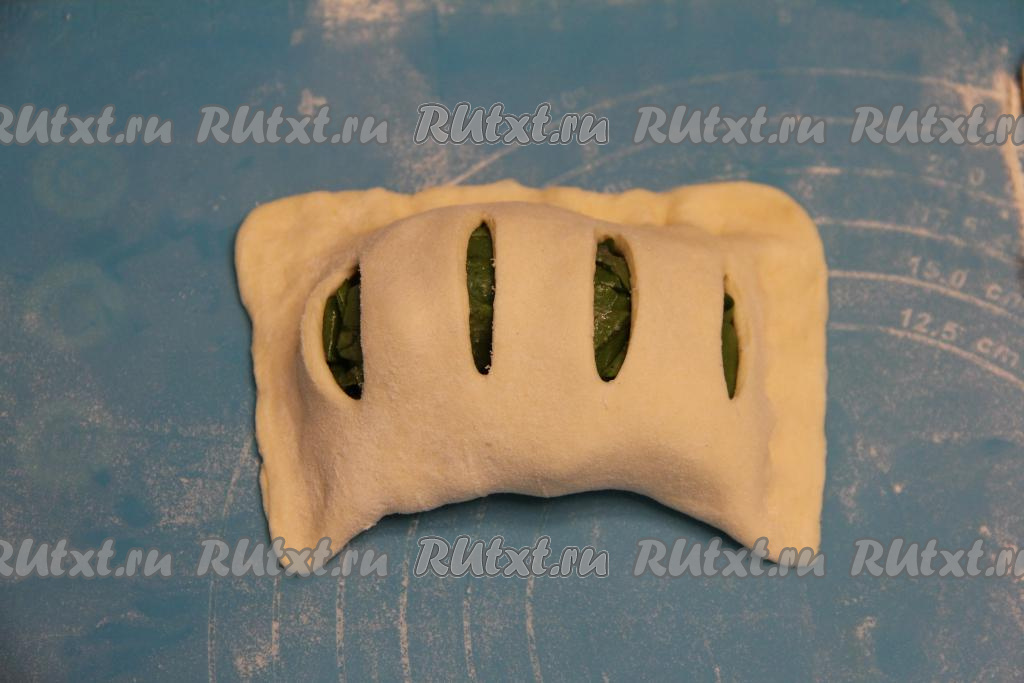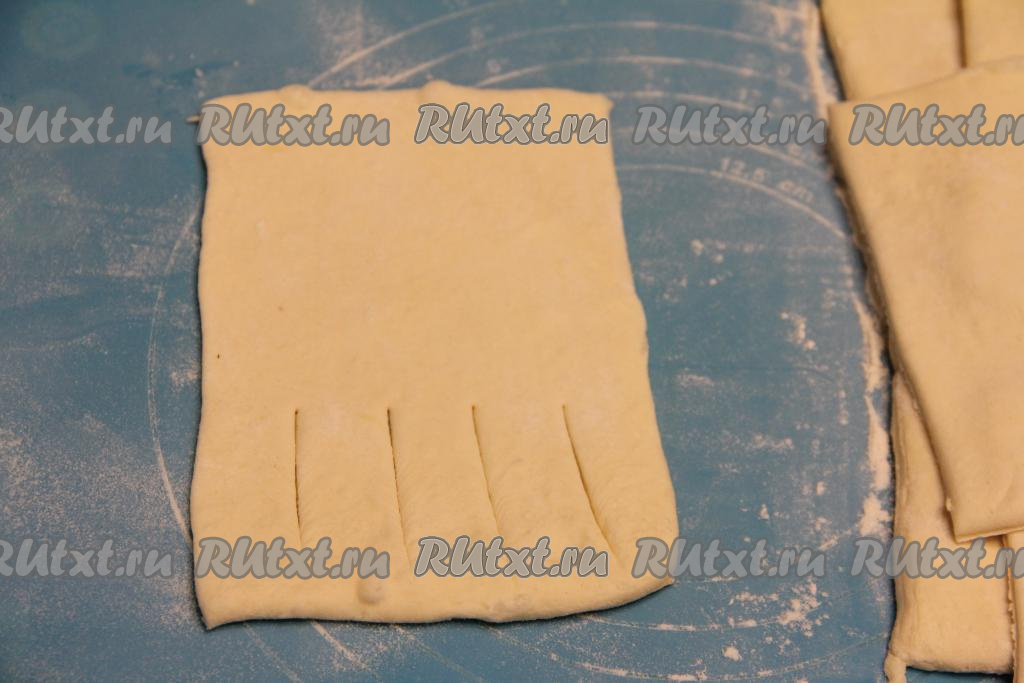Зрительно каждую заготовку теста разделить на две половины. На одной половине заготовки, отступив от краёв теста по 1-1,5 сантиметра, сделать 4 разреза.