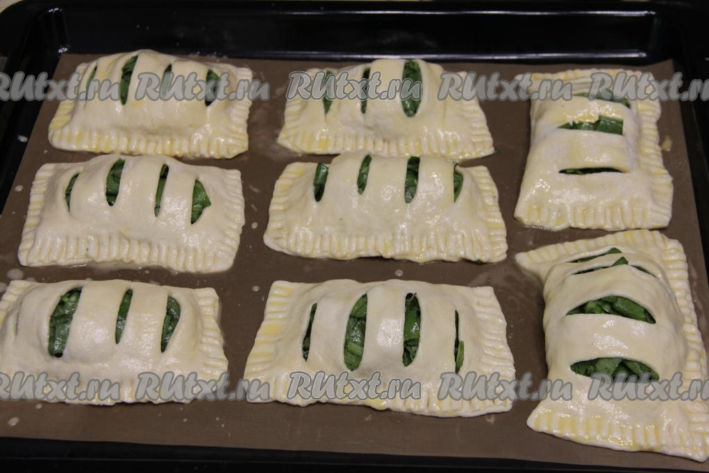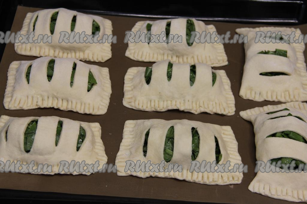 Выпекать пирожки со щавелем в разогретой до 200 градусах минут 20-25 (до золотистого цвета слоёного теста).