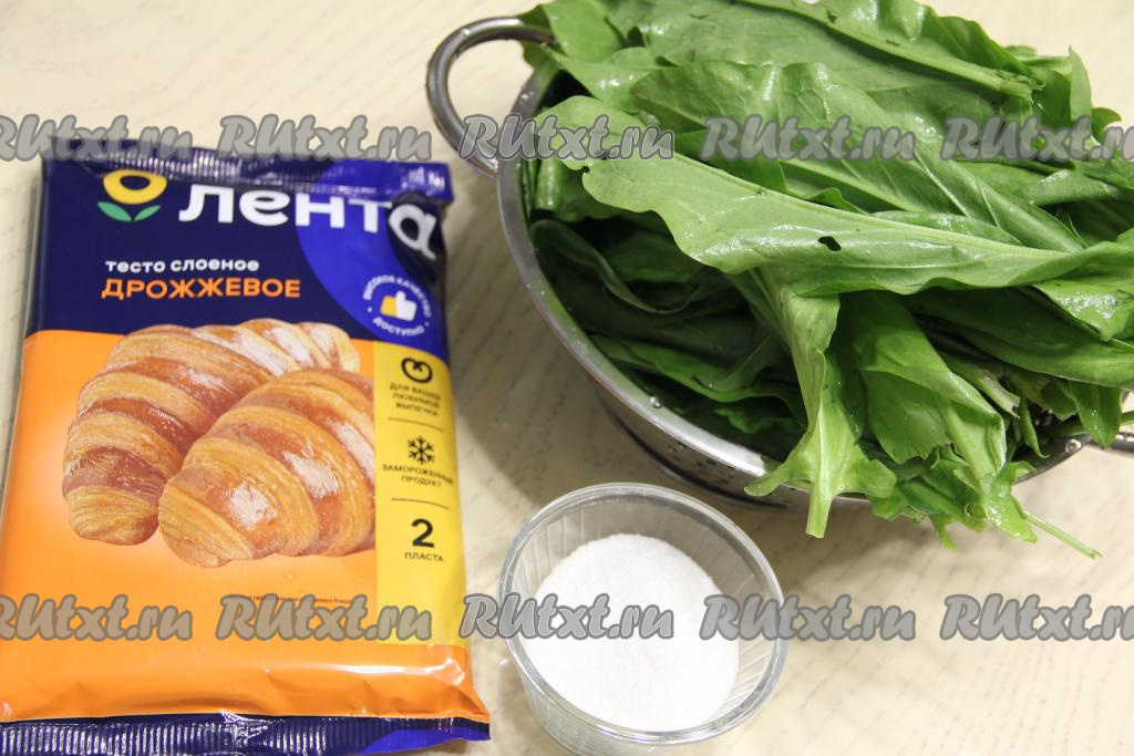 Подготовить продукты. Щавель тщательно промыть водой, затем обсушить его. Слоёное тесто разморозить при комнатной температуре. Для этой выпечки слоёное тесто можно взять как дрожжевое, так и бездрожжевое.