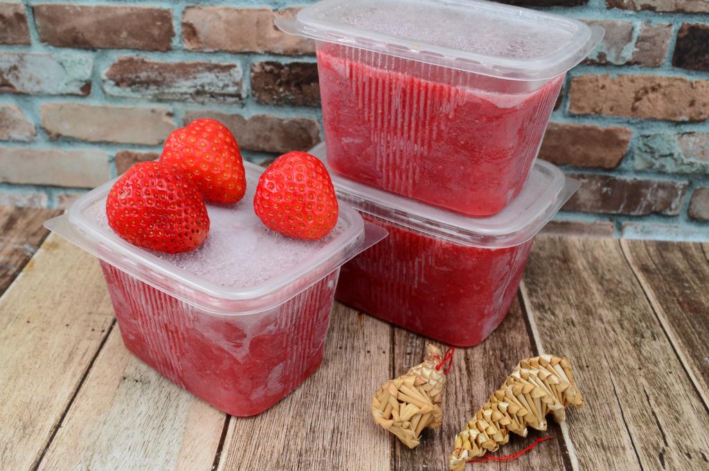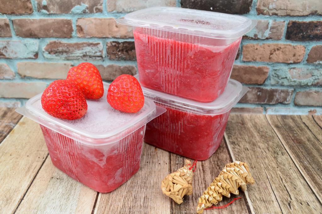 Клубничное пюре, смешанное с сахаром, разложить по чистым пластиковым контейнерам. Я разложила по 3 контейнерам объёмом по 350 миллилитров.