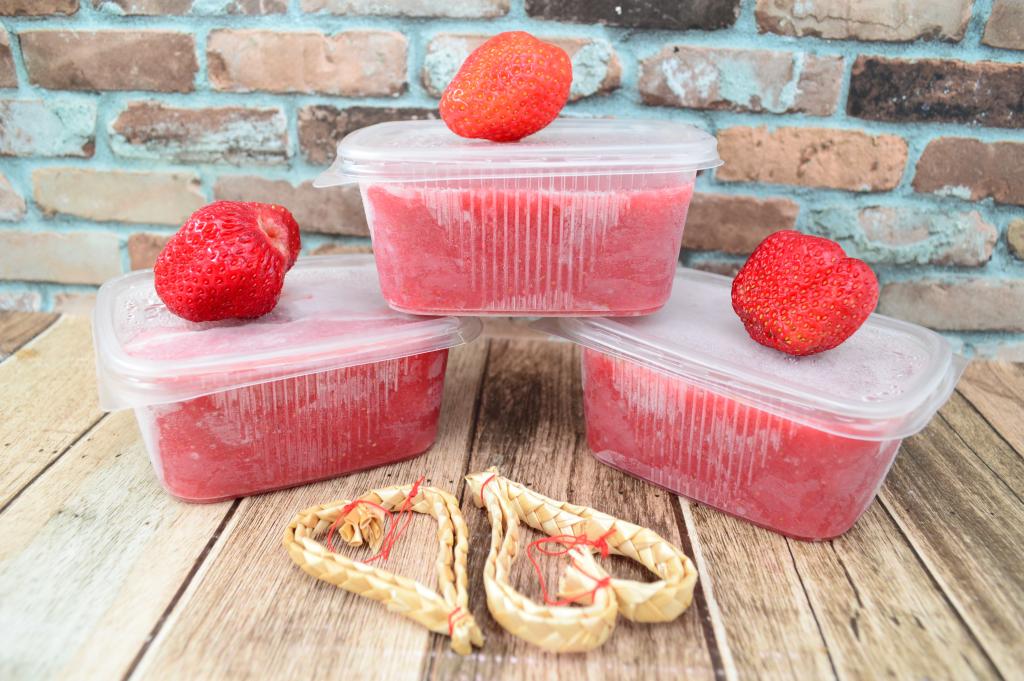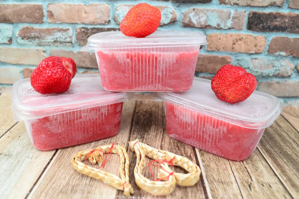 Плотно закрыть контейнеры с клубнично-банановым пюре крышками и отправить их в морозилку.