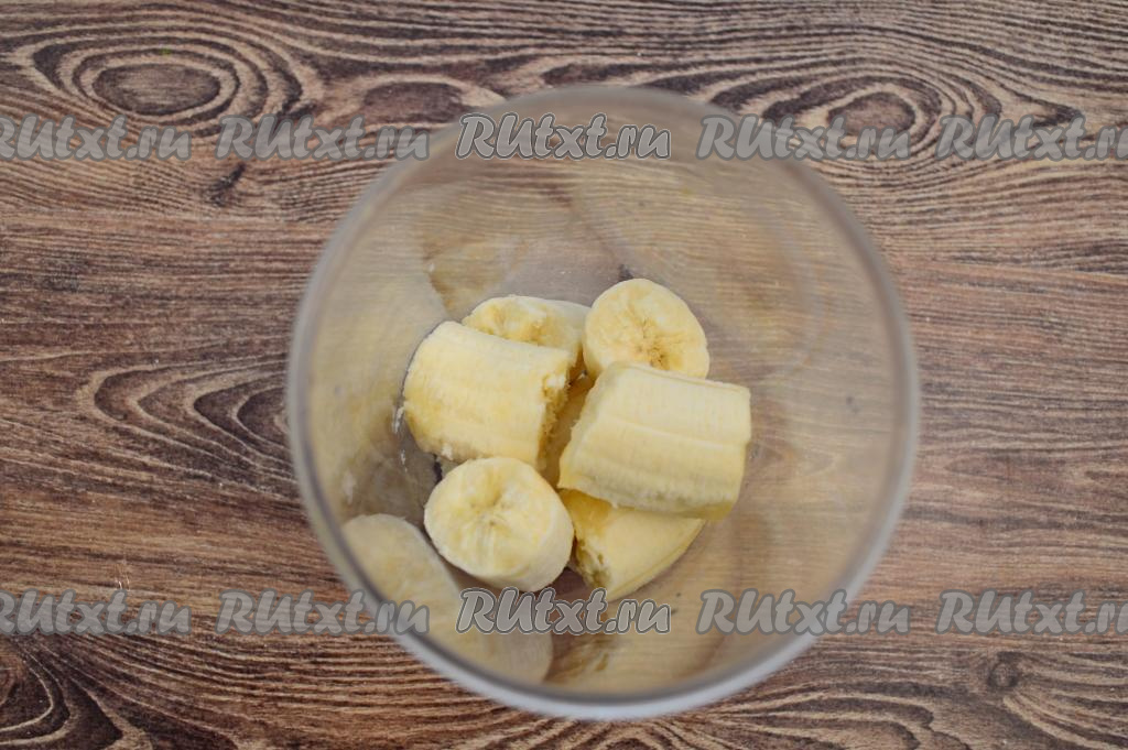 Бананы очистить, поломать на кусочки, сложить в чашу погружного блендера.