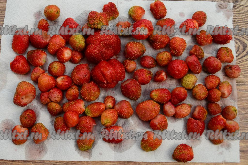 Клубнику отделить от чашелистиков, хорошо промыть водой, а затем немного обсушить, разложив ягоды на бумажном полотенце.