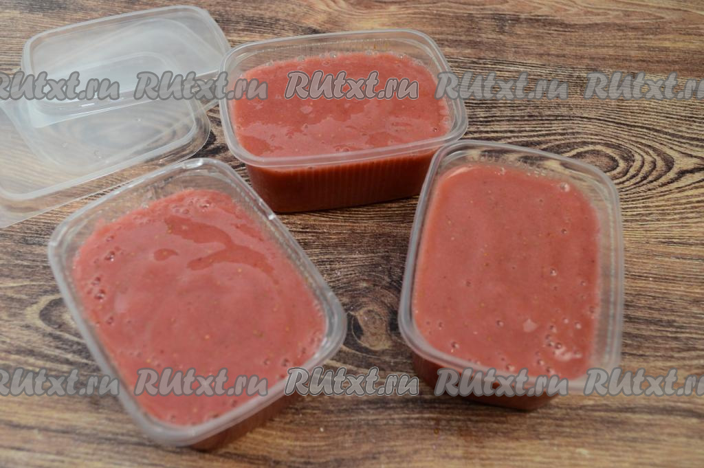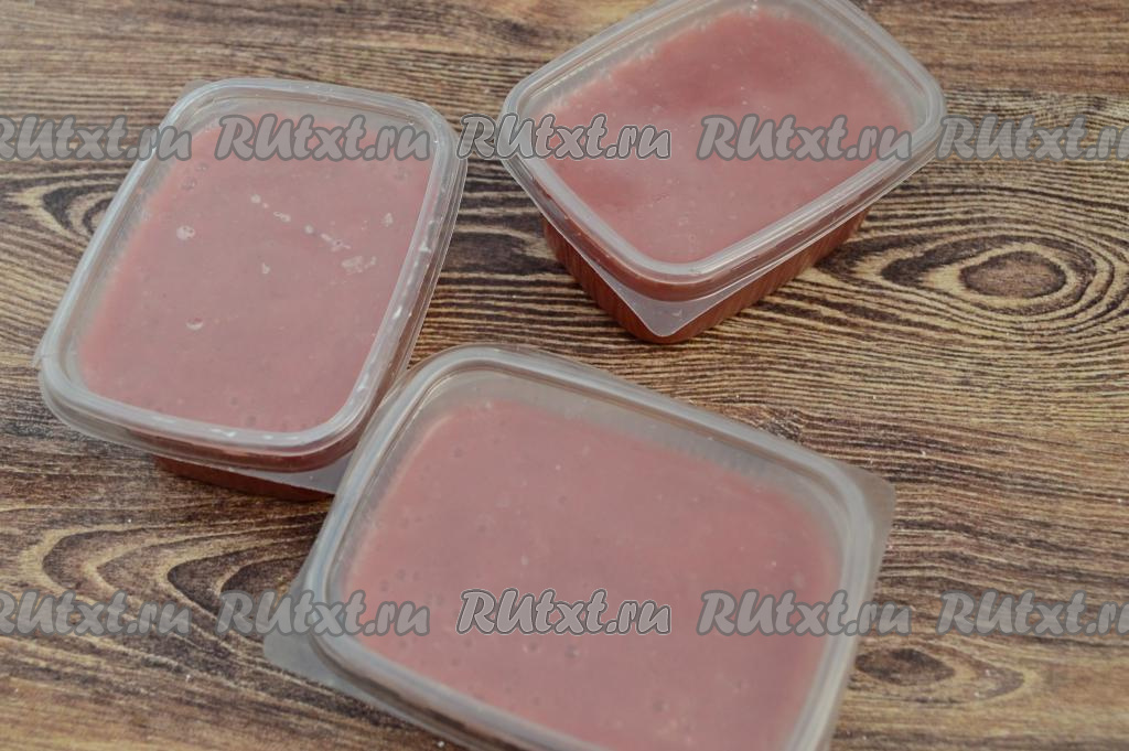 Подготовленное ягодно-фруктовое пюре разлить по пластиковым контейнерам. Я заполнила 3 контейнера по 250 миллилитров каждый.