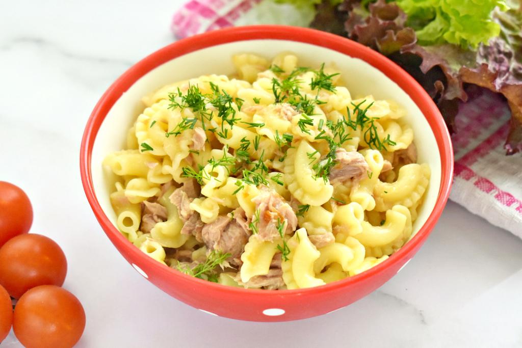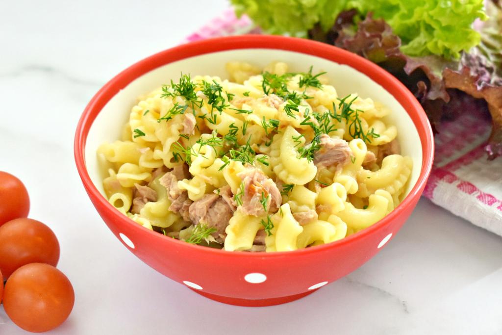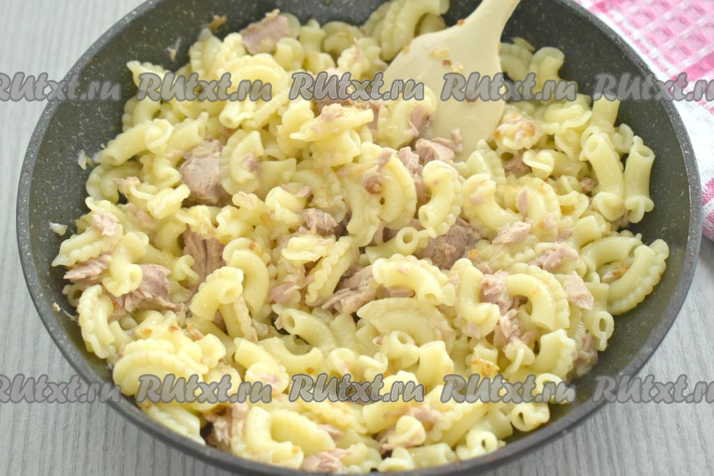 Перемешиваем макароны с тунцом и луком, прогреваем на среднем огне 2-3 минуты, периодически перемешивая. В процессе обжаривания пробуем на вкус, если нужно, досаливаем. Готовое блюдо убираем с огня.