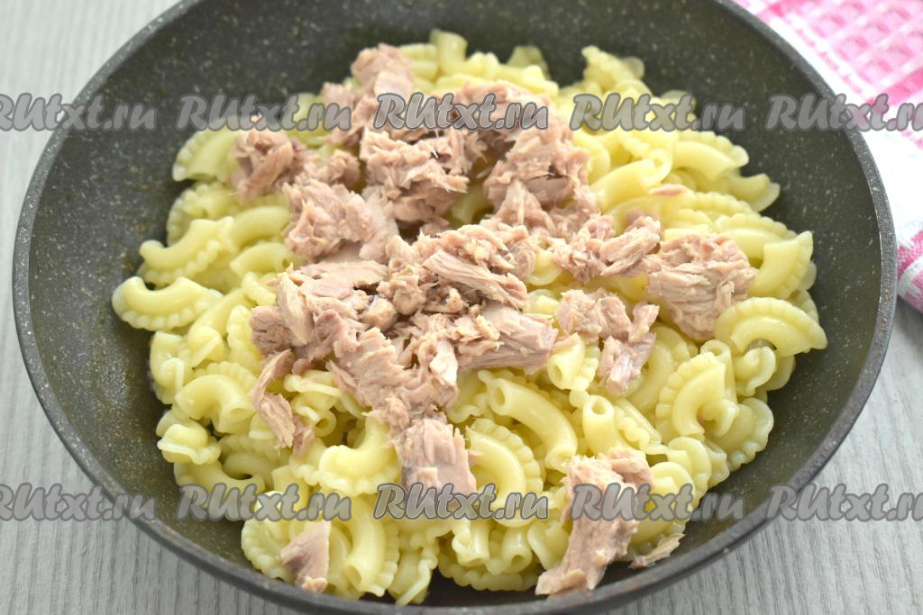 Когда вся вода с макарон сольётся, перекладываем их на сковороду с обжаренными луком и чесноком, добавляем кусочки консервированного тунца.