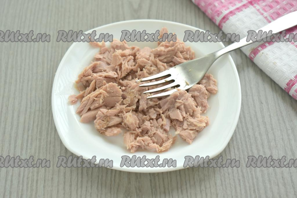 Открываем банку с консервированным тунцом, перекладываем рыбу без жидкости, в которой она находилась в баночке, на тарелку. Разминаем тунца вилкой.