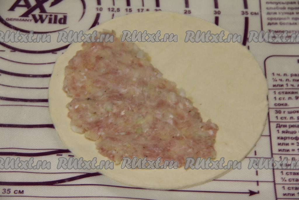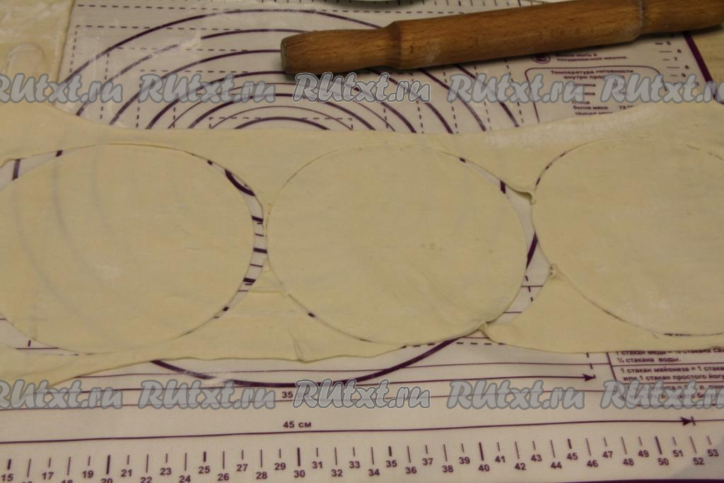 Начинку зрительно разделить на 7 равных частей (по количеству вырезанных кругов). На половину вырезанного круга нанести тонким слоем часть начинки, отступив примерно 1,5 сантиметра от края теста.