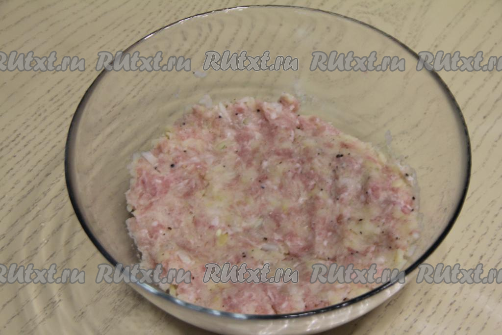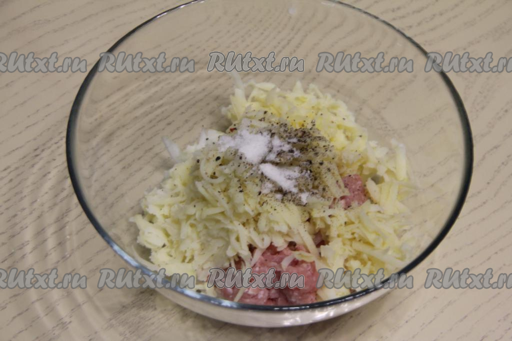 Натёртую картошку добавить в миску с фаршем и луком, всыпать по вкусу соль и чёрный молотый перец.