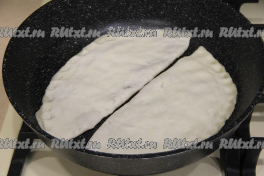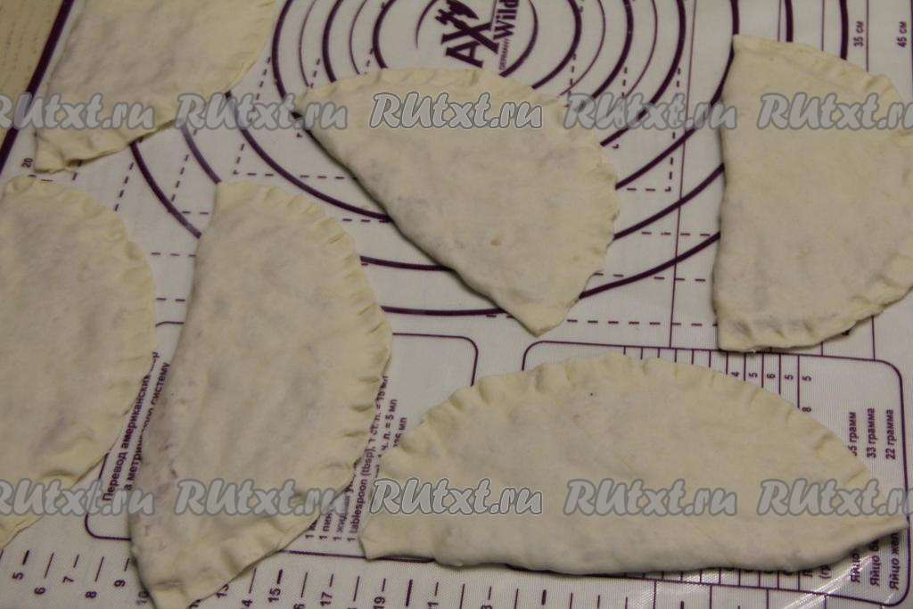 Чистой стороной круга накрыть сторону с начинкой, хорошо скрепить края теста. Я скрепила тесто пальцами, ещё можно скрепить тесто вилкой, периодически окуная зубцы вилки в муку.