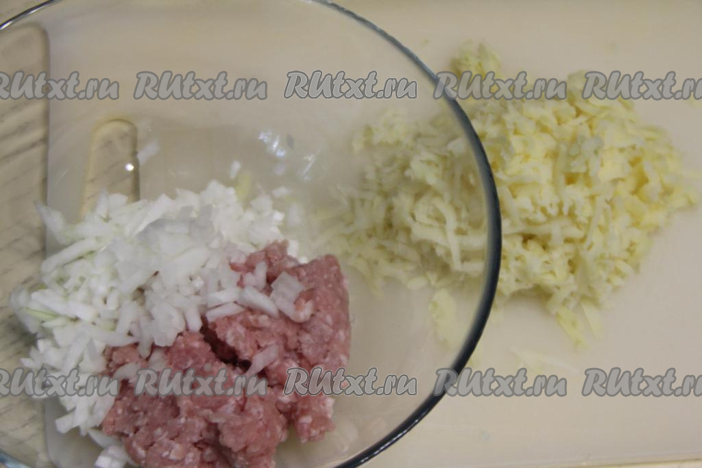 В миске соединить мясной фарш и мелко нарезанный очищенный лук. Остывшую варёную картошку почистить, натереть на крупной тёрке.