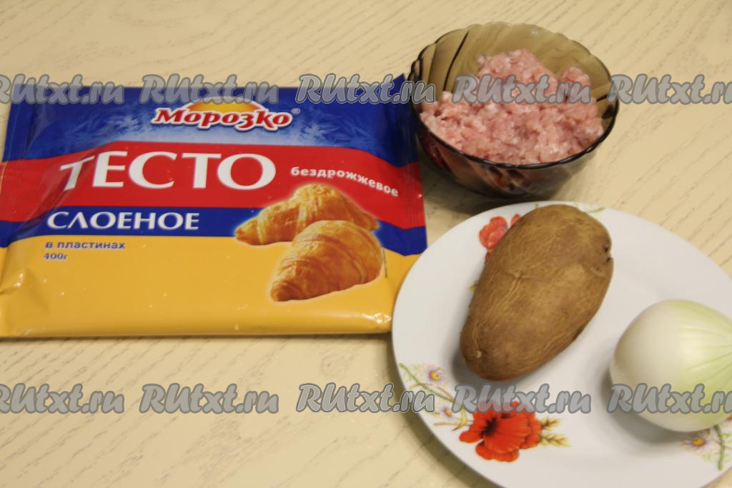 Подготовить продукты. Слоёное тесто разморозить при комнатной температуре. Пока размораживается тесто, отварить картошку в кожуре до готовности (в течение минут 25-30 с момента закипания воды), затем остудить. Мясной фарш можно взять покупной или приготовить в домашних условиях, пропустив кусочек мяса (например, свинину, куриное филе или индейку) через мясорубку. Я использовала свиной фарш.