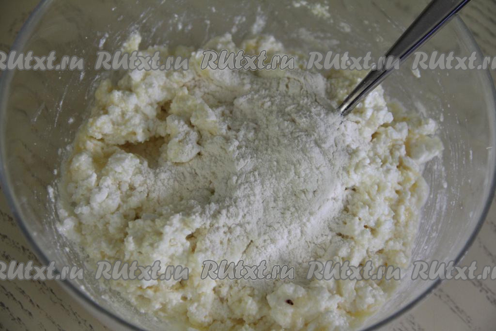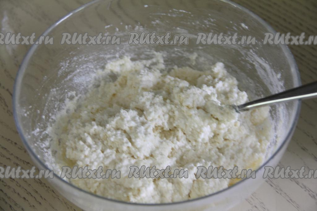 Перемешать творожную массу вилкой до однородности. Начать постепенно, по половине столовой ложки, всыпать муку в творожную массу, каждый раз полностью вмешивая её в тесто.
