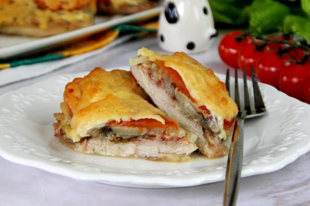 Мясо на куриных бёдрах сочное, нежное. Поэтому предлагаю приготовить в духовке мясо по-французски, взяв за основу филе куриных бёдер. Мясо запекается с помидорами, шампиньонами и сыром, получается очень нежным, вкусным, аппетитным и сочным. Для этого рецепта можно взять бёдра курицы и разделать их на филе, а можно сразу купить филе куриных бёдер. Это наивкуснейшее блюдо при подаче можно дополнить гарниром или салатом из свежих овощей.