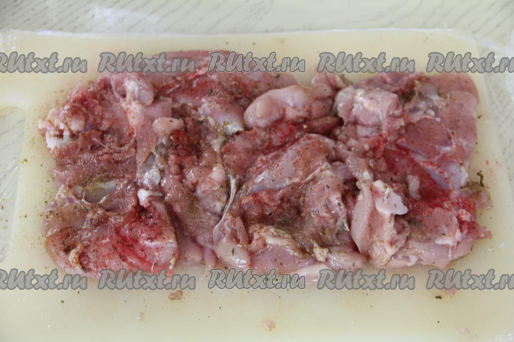 Тщательно втереть соль и специи в куриное мясо со всех сторон.