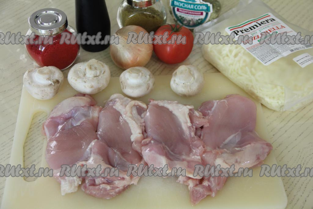Подготовить продукты. Помидоры и шампиньоны промыть водой. Куриные бёдра разделать на филе, удаляя кожу, кости и лишний жир. Можно в магазине купить и уже отделённое от костей филе куриных бёдер. Мясо промыть водой, обсушить.