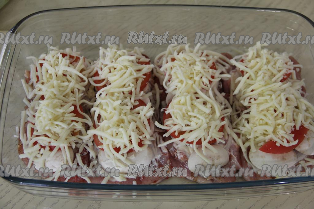 Поверх грибов разложить помидоры, нарезанные на кружочки, немного посолить, можно слегка смазать майонезом. Помидоры сверху присыпать сыром, натёртым на крупной тёрке.