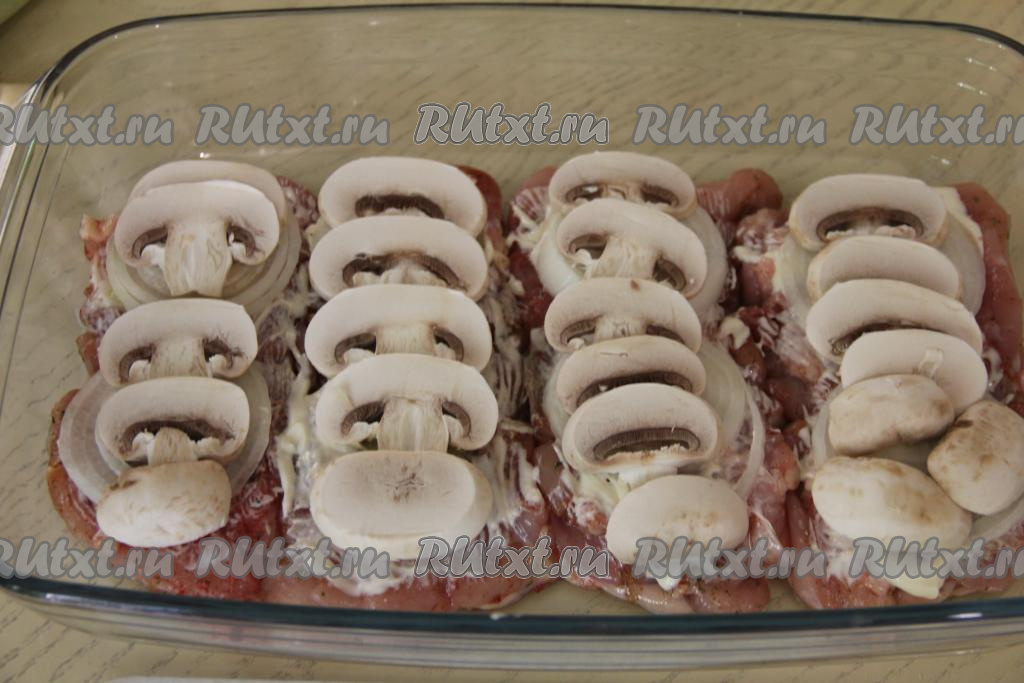 Поверх лука на каждое филе выложить шампиньоны, нарезанные на тонкие пластины.