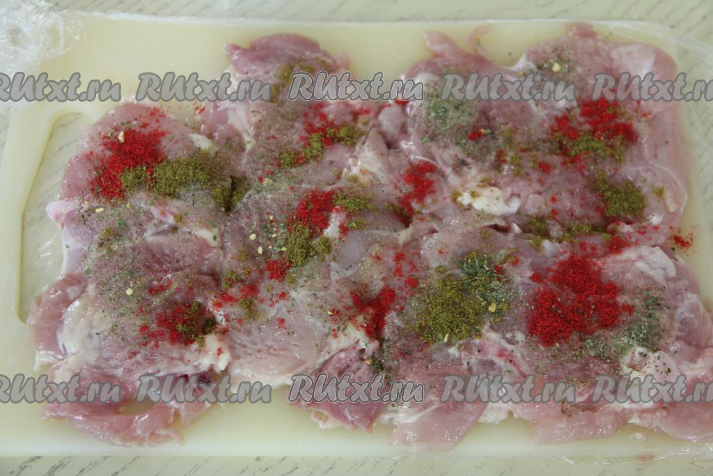 Затем добавить к мясу соль и специи (в качестве специй я добавила паприку, чёрный молотый перец, хмели-сунели и соль со специями).