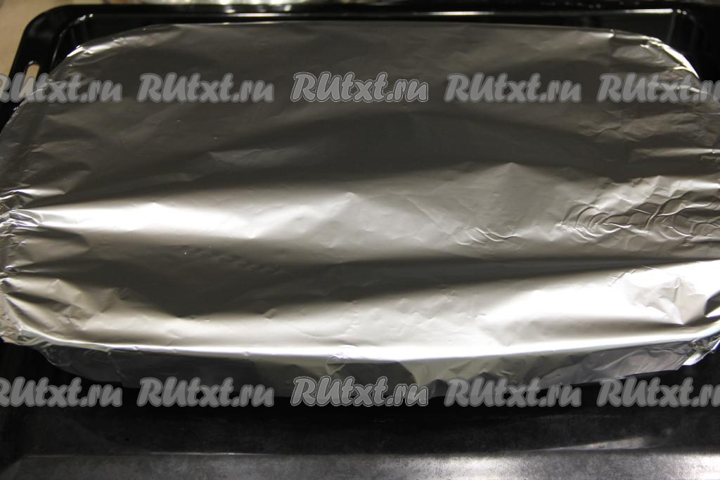 Накрыть форму фольгой и поставить в духовку, разогретую до 180 градусов, запекать мясо по-французски из куриных бёдер 45-50 минут.