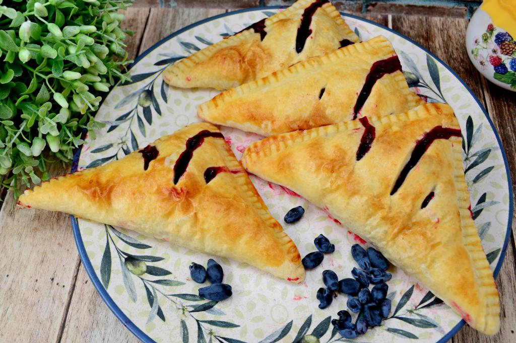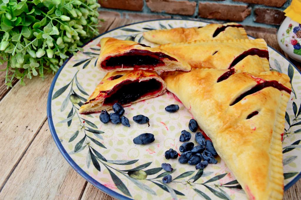 А вот как аппетитно смотрится в разрезе слойка с жимолостью. Сочетание яркой кисло-сладкой начинки и нежного, воздушного слоёного теста делает эту выпечку очень вкусной!