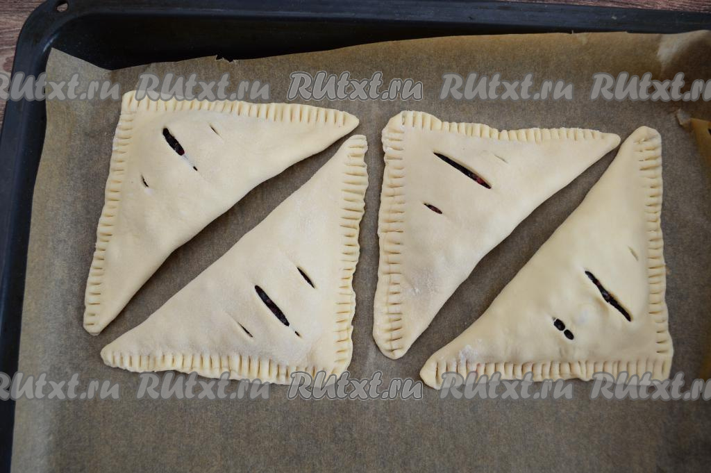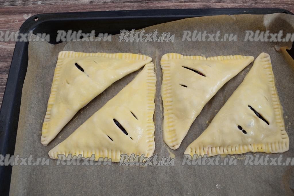 Готовые слойки с ягодной начинкой достать из духовки, дать немного остыть и можно подавать их к столу.