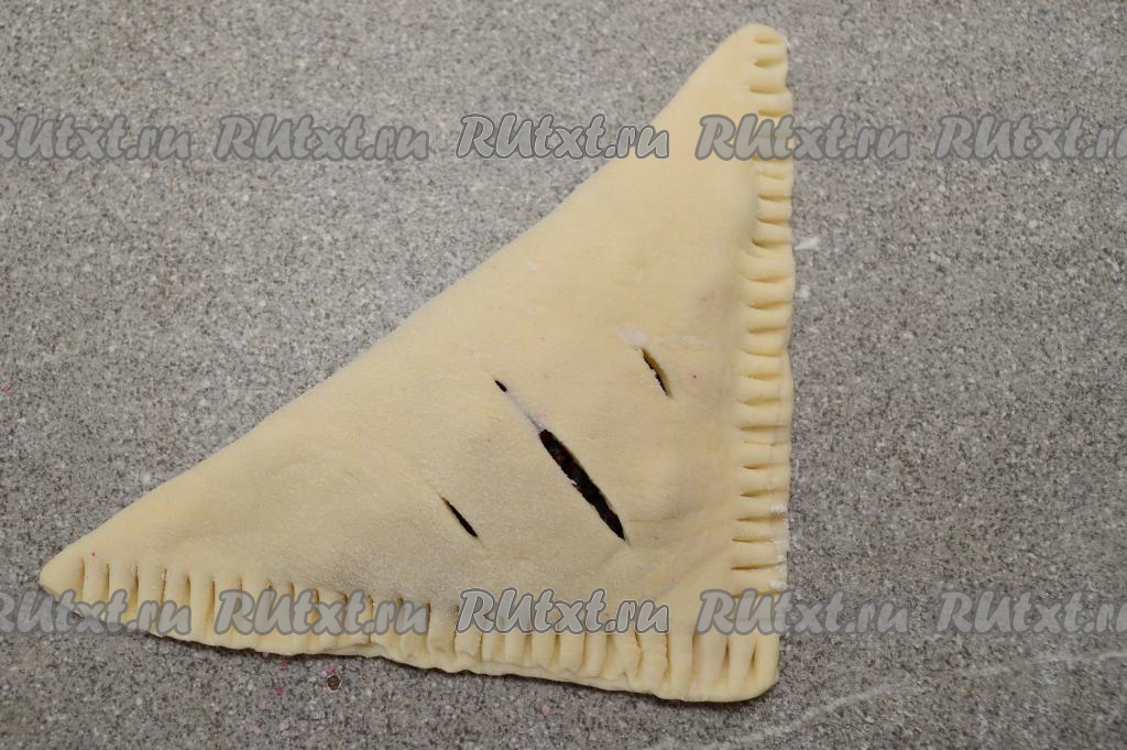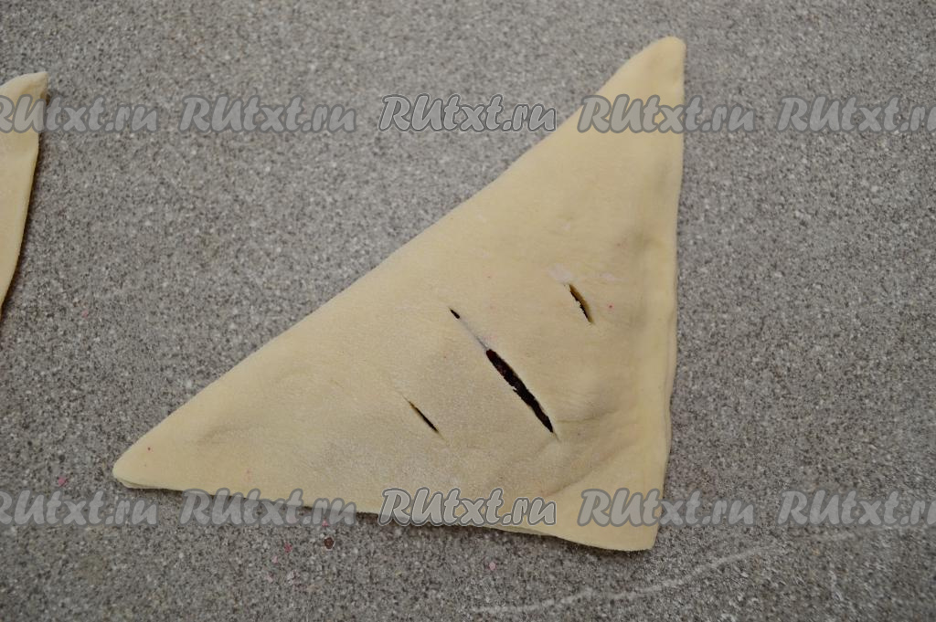 Ближе к одному из углов раскатанного квадрата из теста сделать ножом три разреза.