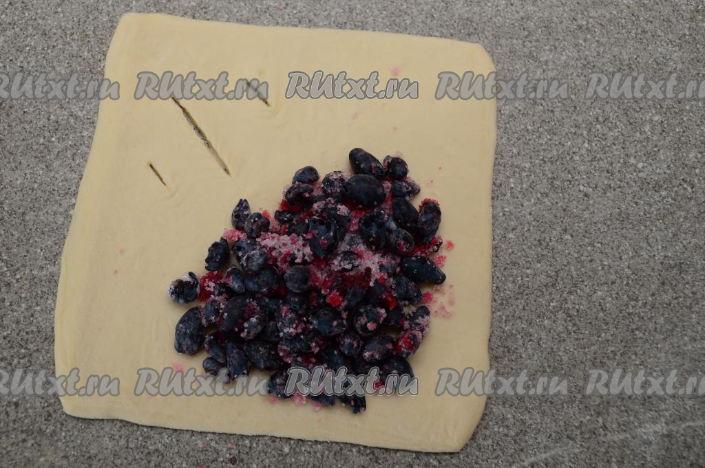 Крахмал добавляется для того, чтобы сок, который будет выделяться из жимолости в процессе выпечки, не вытекал, а желировался и оставался внутри слоек.
