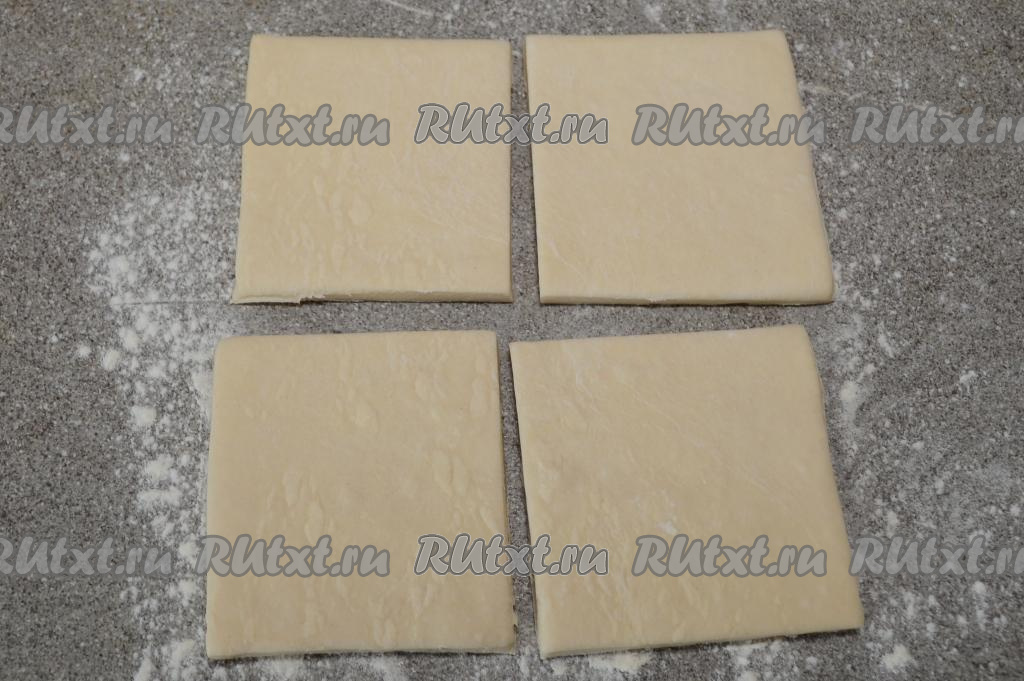 Рабочую поверхность слегка присыпать мукой, выложить пласт разморозившегося теста. Разрезать пласт теста на 4 равных части.