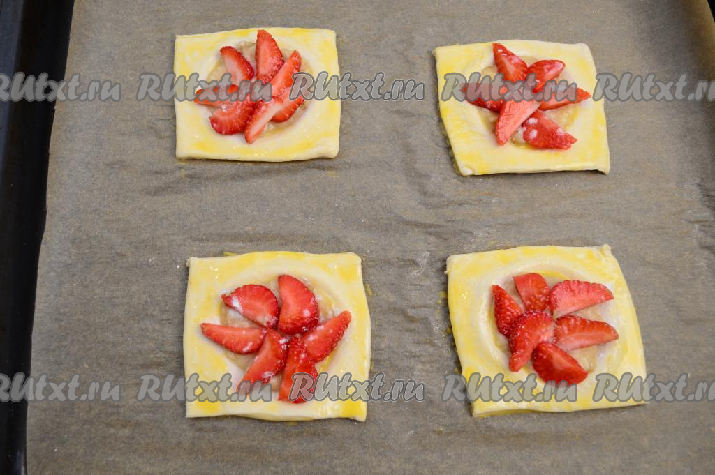 Вилкой в небольшой ёмкости взболтать яичный желток до однородности. При помощи кулинарной кисти получившейся яичной смесью смазать тесто слоек. Каждую слойку (и клубнику, и тесто) присыпать 0,5 чайной ложки сахара.