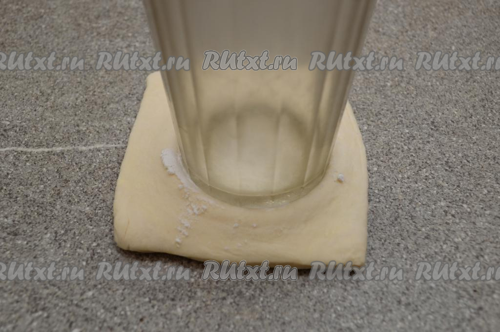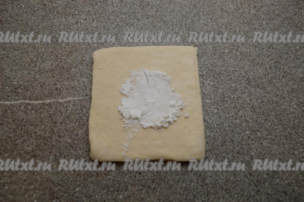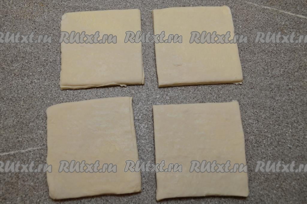 Совсем чуть-чуть припылить стол мукой, выложить разморозившееся тесто. Не раскатывая, разрезать тесто на 4 квадрата.