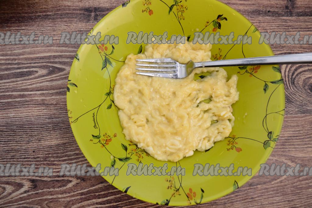 Банан очистить от кожуры, разломать на части, выложить в тарелку, размять вилкой до получения пюре.