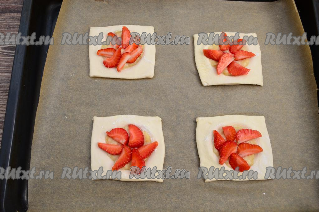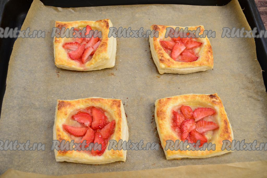Слойки с клубникой и бананом выпекать в разогретой до 200 градусов духовке в течение 20 минут (до приятного зарумянивания слоёного теста).