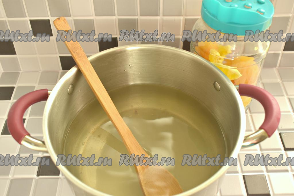 По прошествии 20 минут воду из банок с фруктами сливаем в кастрюлю (удобно сливать воду, надев на банку специальную крышку с дырочками). В кастрюлю с водой, слитой из банок, всыпаем сахар, перемешиваем, ставим на огонь, после закипания провариваем сироп на небольшом огне 1-2 минуты (кристаллы сахара должны раствориться).