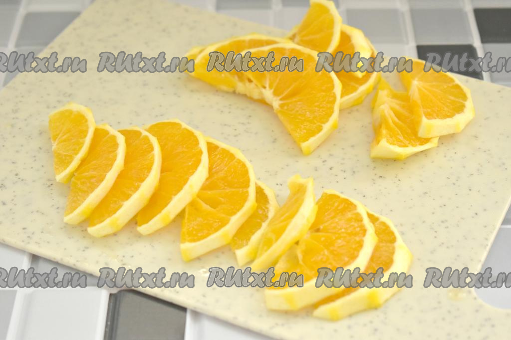 Очищаем апельсин от кожуры. Разрезаем апельсин пополам. Каждую половинку апельсина нарезаем на полукружочки, удаляя косточки.