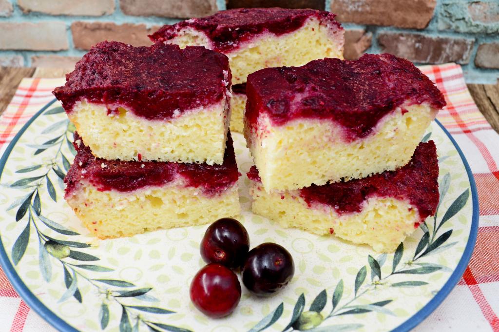 Готовую запеканку полностью остудить, а затем нарезать на кусочки и подать к столу. Пушистый творожный слой и нежнейшее желе из черешни делает эту запеканку очень вкусной, она долго не задерживается на столе.