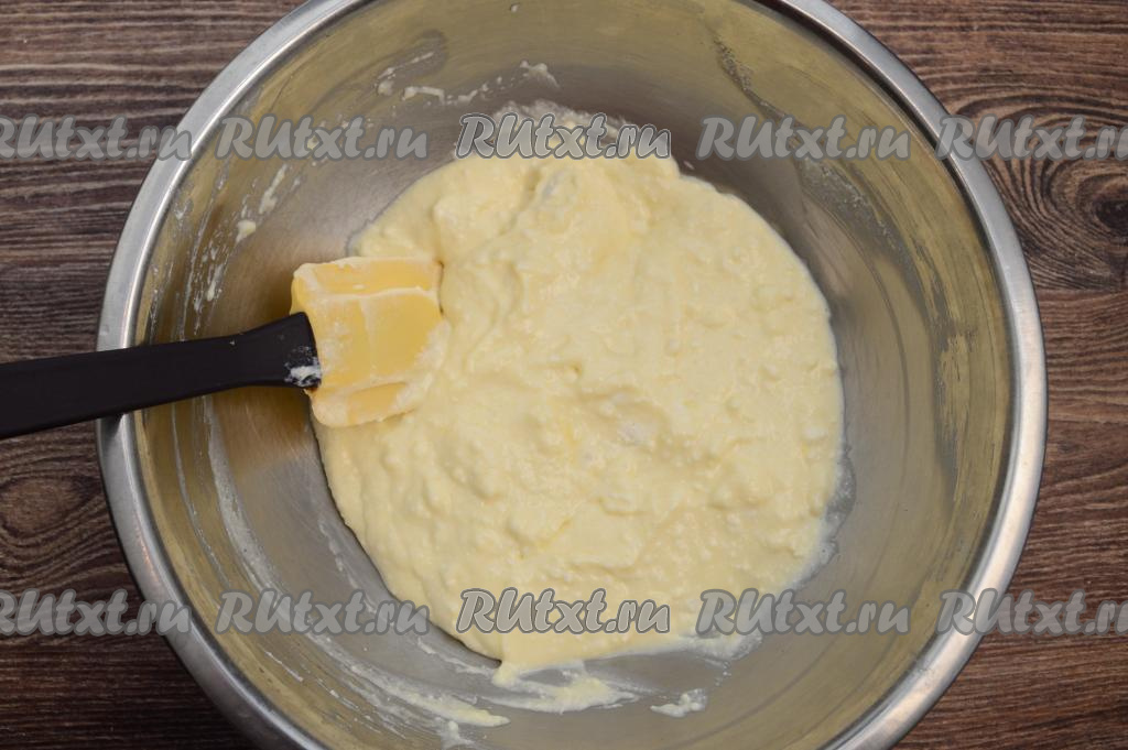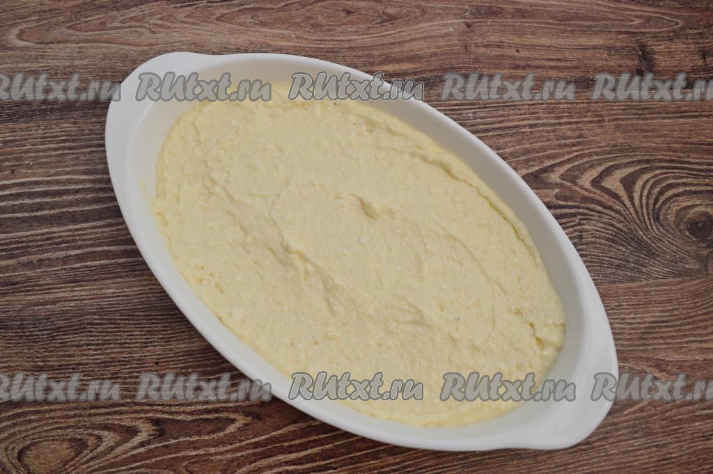 Перемешать тесто для запеканки и оставить его на 10 минут, чтобы манка набухла. Тесто должно получиться в меру густым, однородным и вязким.