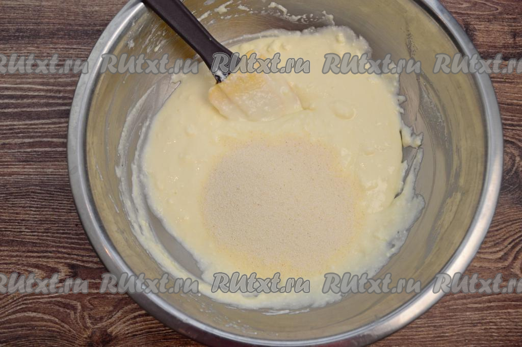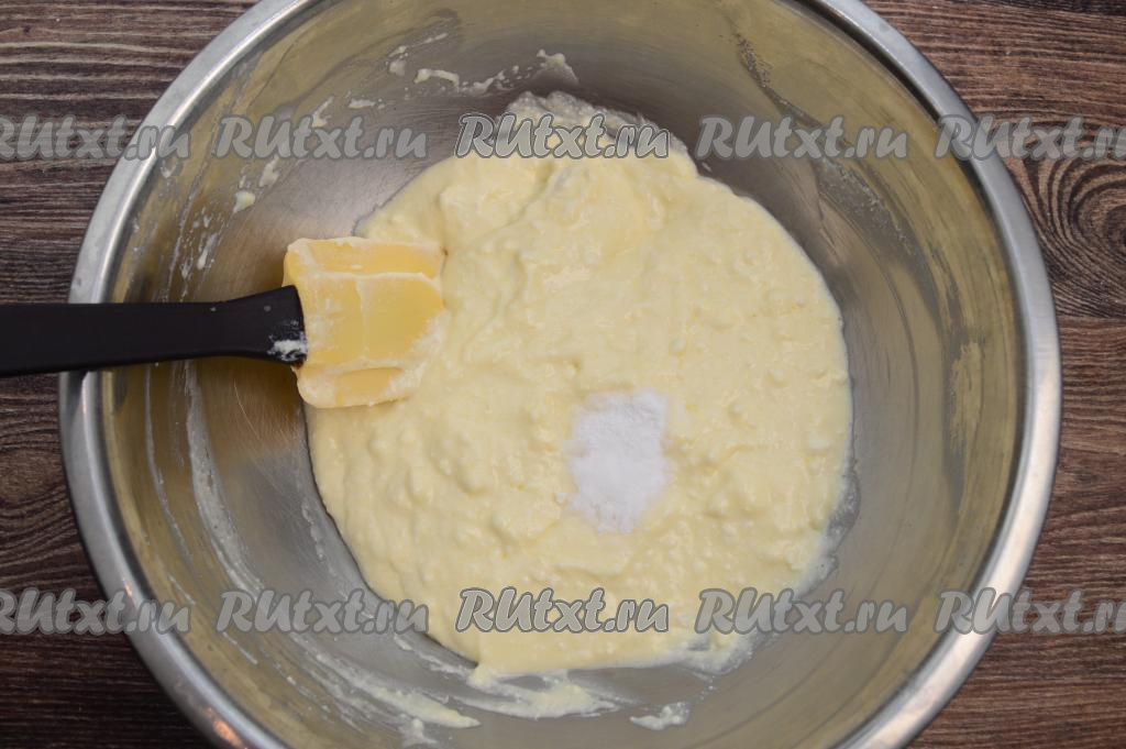 В получившуюся творожную массу всыпать разрыхлитель, хорошо перемешать.