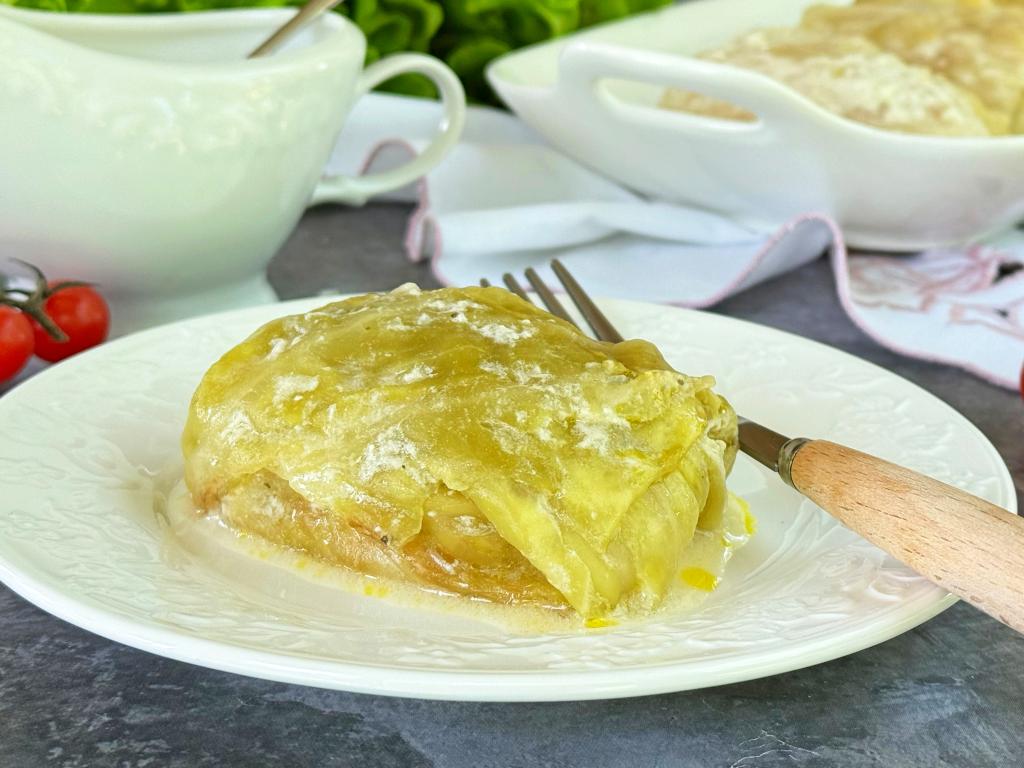 Затем подвернуть боковые части листа на начинку и, начиная со стороны с начинкой, свернуть капустный лист в рулетик, формируя голубец.