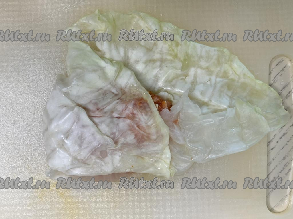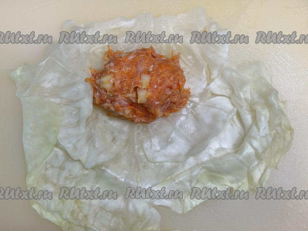 Начинку разделить на 7 частей (по количеству подготовленных капустных листьев). На подготовленный лист капусты ближе к утолщённому краю листа выложить одну часть начинки, подвернуть вначале утолщённую часть листа на начинку.