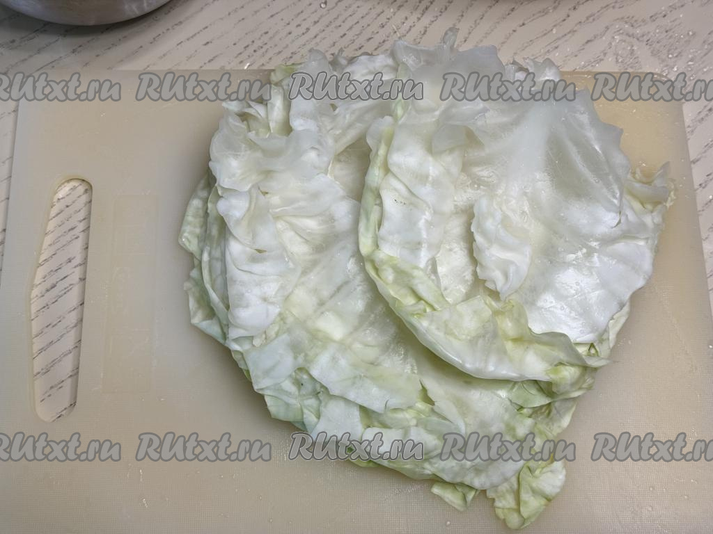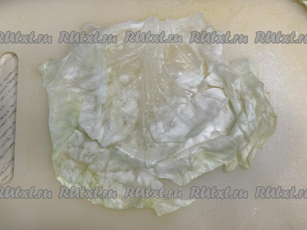 Капустные листья размягчить любым способом. Я помещаю кочан в пакет и отправляю на 5-7 минут в микроволновку на максимальную мощность, затем снимаю обмякшие листочки, снова помещаю капусту в микроволновку на 5-7 минут, обмякшие листы снимаю. Если не хотите готовить в микроволновке, тогда можно поместить кочан в кастрюлю с кипящей водой, проварить минут 5, обмякшие листы снять, затем продолжить отваривать, снимая слегка обмякшие капустные листы. В этот раз мне для приготовления голубцов понадобились 7 листов капусты. Дать листам немного остыть.