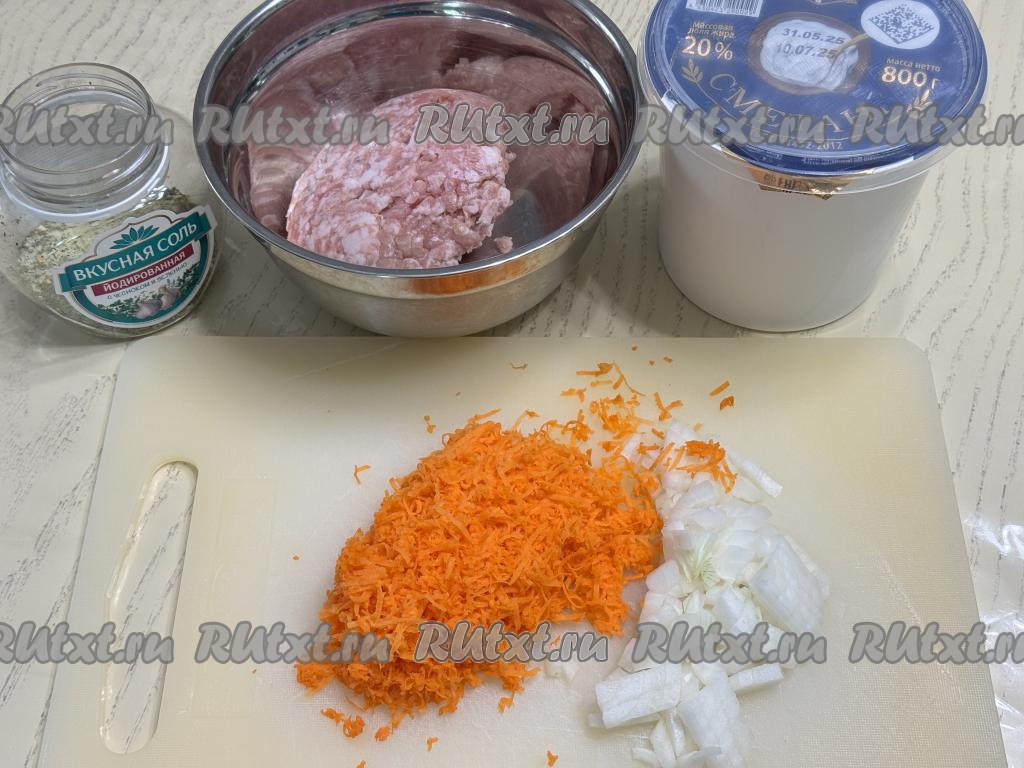 В миске соединить мясной фарш, морковь и лук, посолить по вкусу, добавить чёрный молотый перец, тщательно вымесить фарш.
