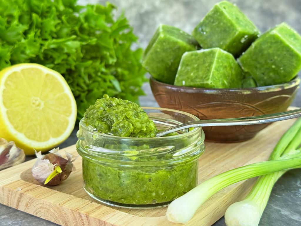 Паста из зелёного лука в холодильнике может храниться недолго, не более месяца, а замороженные кубики можно хранить в морозилке более года.